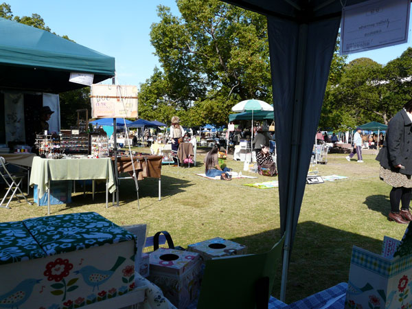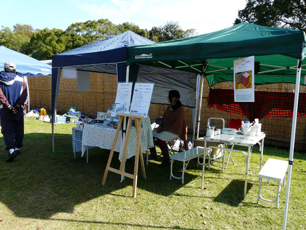タープを2つくっつけて、南側で体験教室、北側で作品とキットを販売しています。