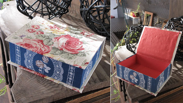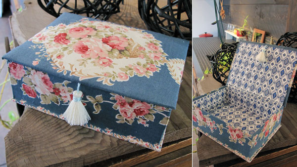 Uさんはフレンチスタイルの布箱で、エレガントなブルー地のローズ柄と、