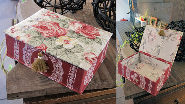 Fさんのフレンチスタイルの布箱、エレガントローズ2種をレッド系でまとめられました。