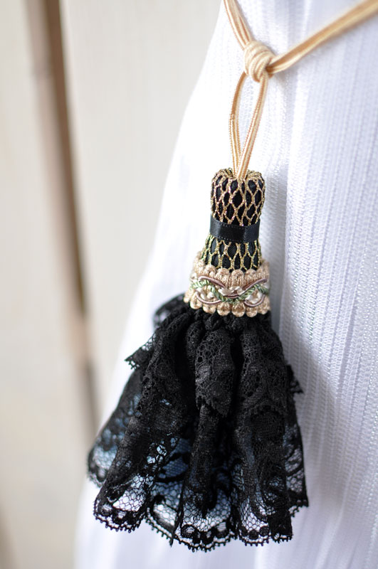 ブラックのレース、ブルーの房糸、ゴールドのネットとコード。