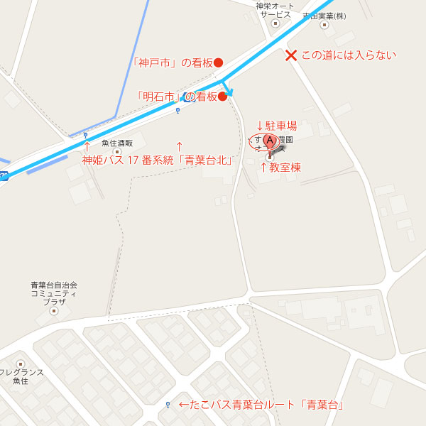 JR魚住駅より、たこバス青葉台ルート「青葉台」下車、徒歩約3分