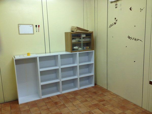 ↓入口から左の奥にはカラーボックスが、写真より1台増えて5台並んでいます。